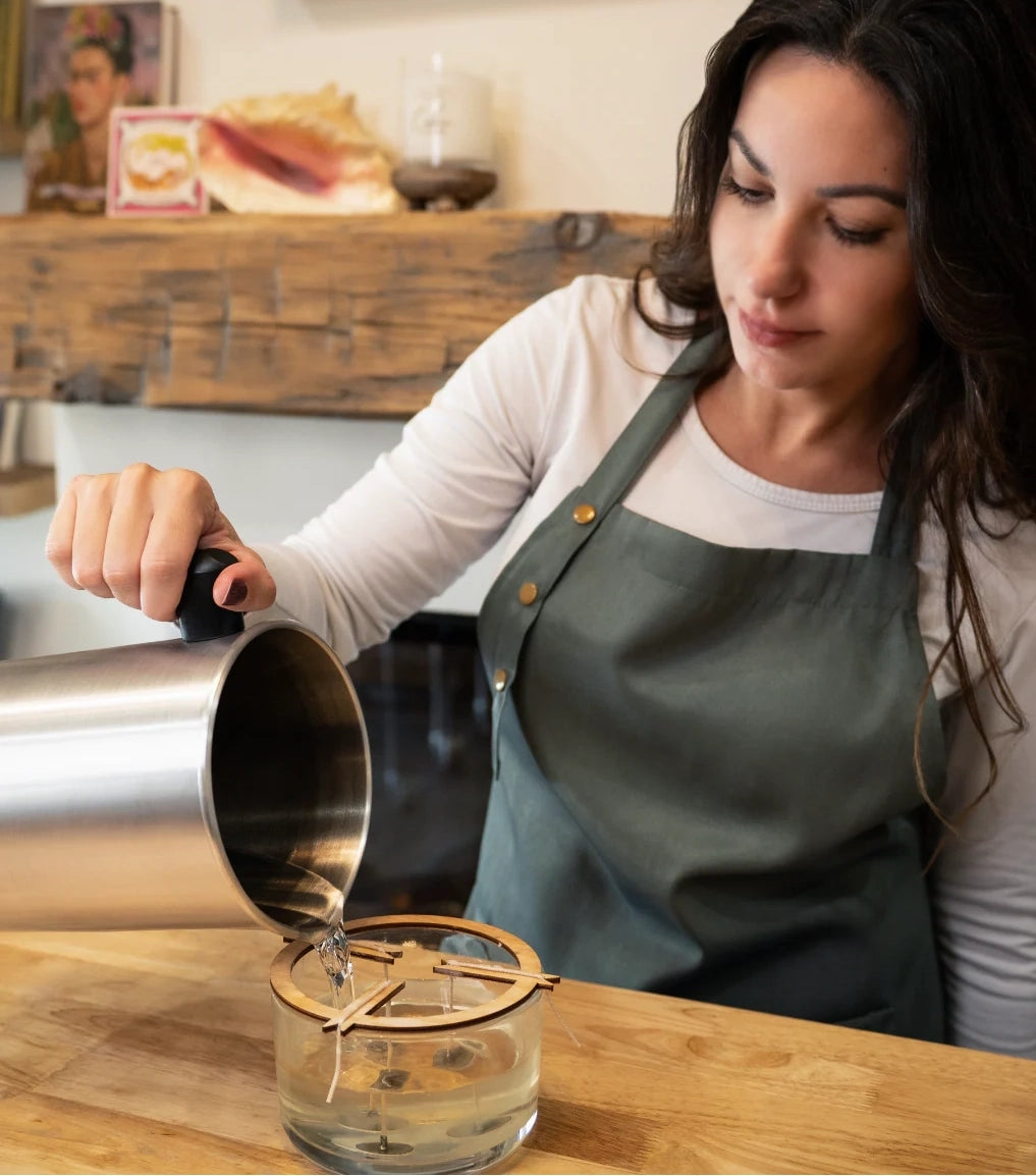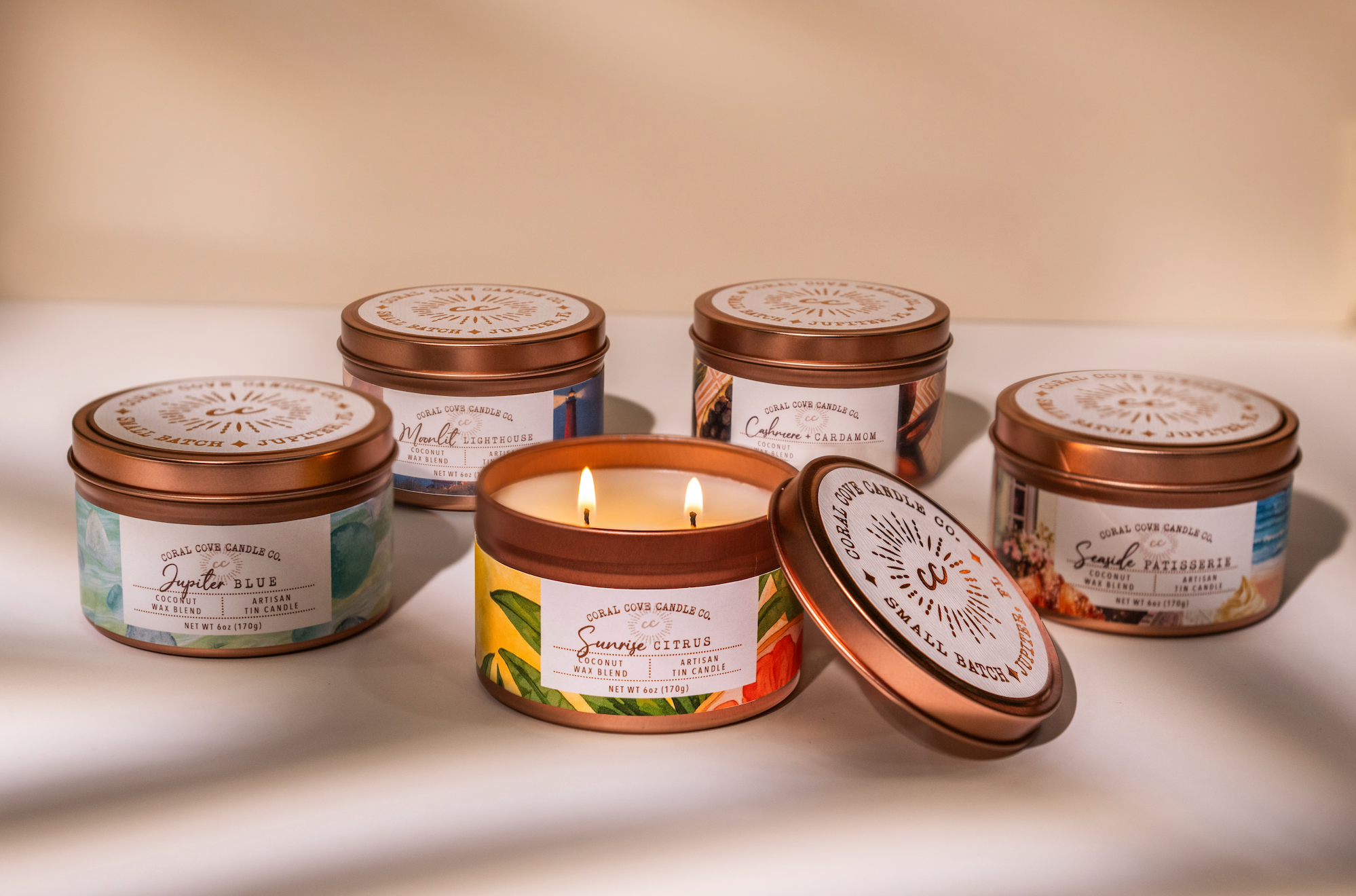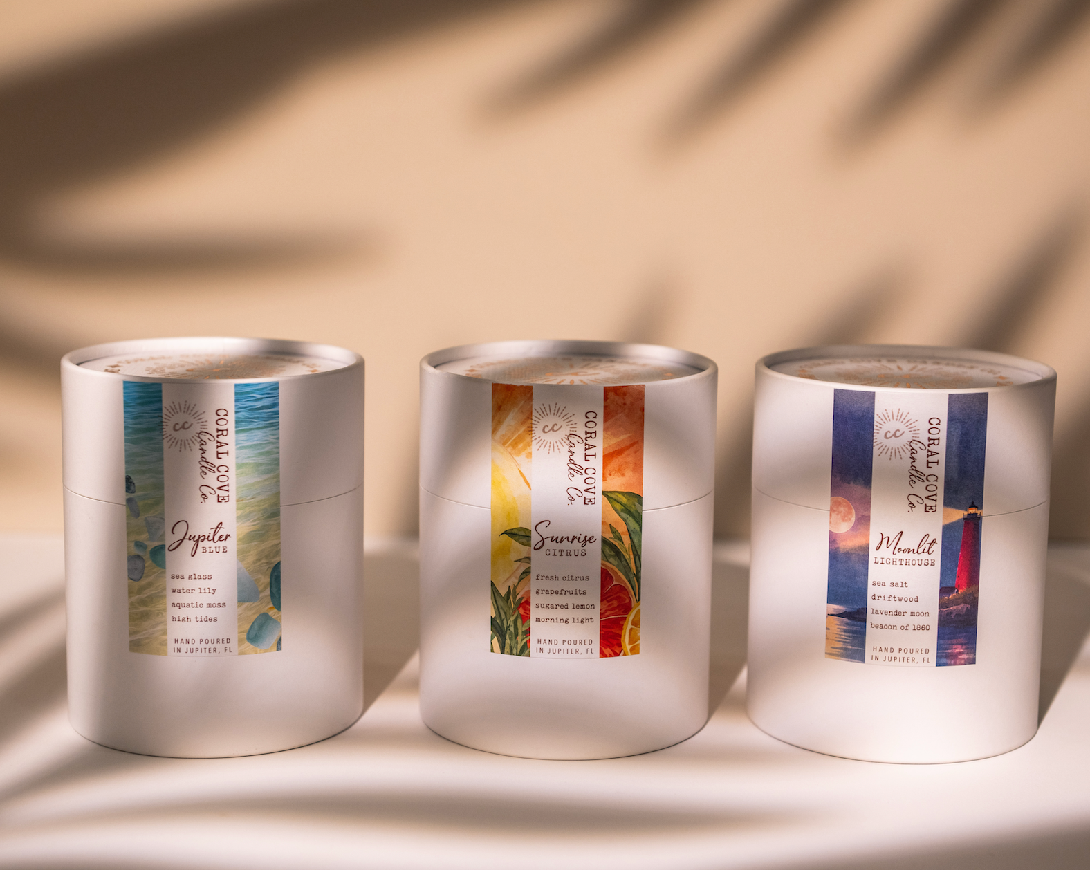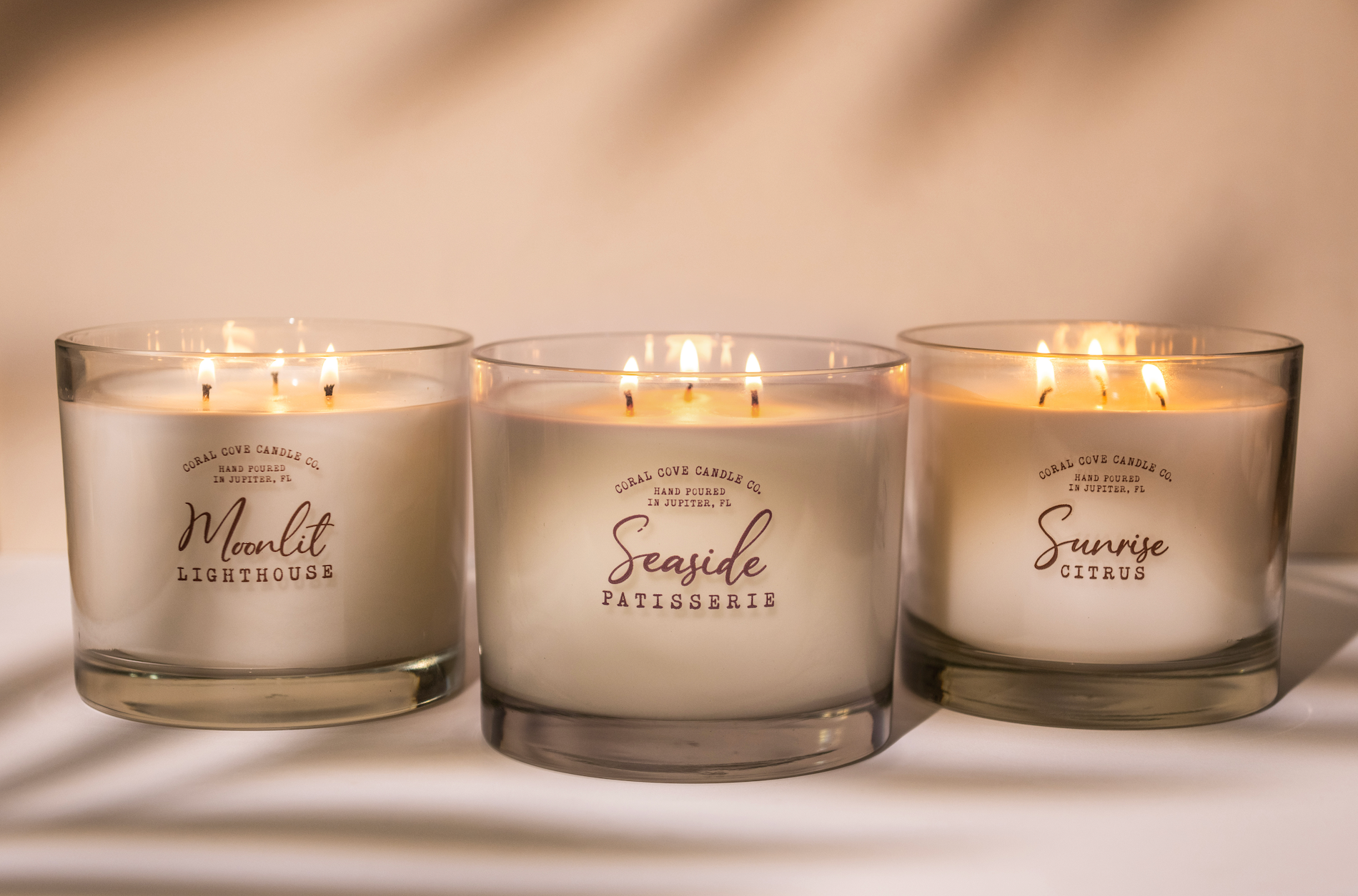 Our natural, coconut wax candles are available in three vessel size options and several signature scents. Why coconut wax? It produces a smooth, clean and even burn from top to bottom without the pitting, sink holes or bumpy texture often found in soy and other wax blends. It's molecular ability to bind with fragrance oils better produces a stellar scent throw, headache-free!