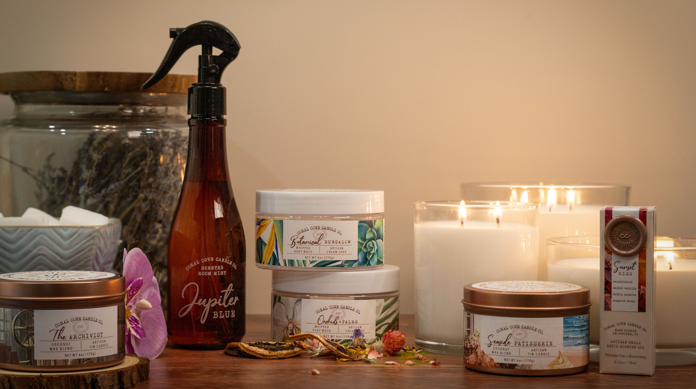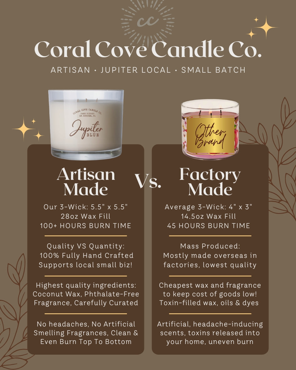 In short, Quality Matters! When it comes to choosing self care, luxury fragranced products for your home, the ingredients released into your air space matters. No headache-inducing, toxin filled fragrances, a cleaner even burn and creatively designed scent blends with artisan packaging. 100% handcrafted, self-funded and artfully designed by a Jupiter local, Florida native, female-owned small business. Shop Small Batch, Support Local.